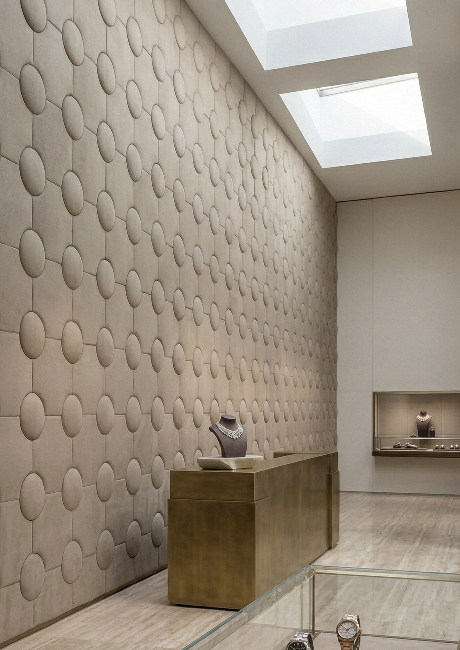 Disco se compone con piezas de gran formato redondas formando una retícula infinita. Un sutil efecto acolchado crea un juego de luces y sombras que potencian su relieve.