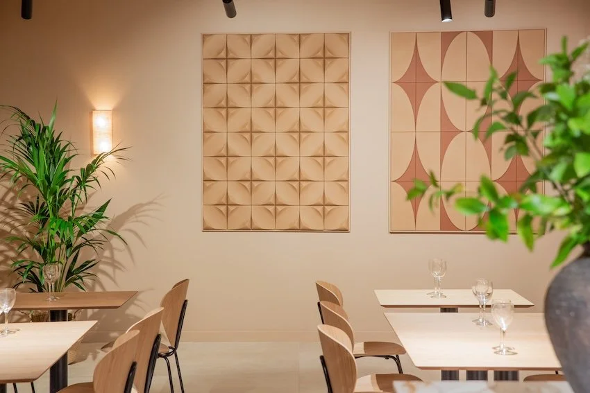 La decoración del restaurante respira la alegría y tranquilidad mediterránea con un ambiente joven y acogedor. Las placas fonoabsorventes Soffitti se han utilizado como solución práctica y decorativa, mientras que las obras de arte en piel decoran los salones dando un toque personal a las paredes.